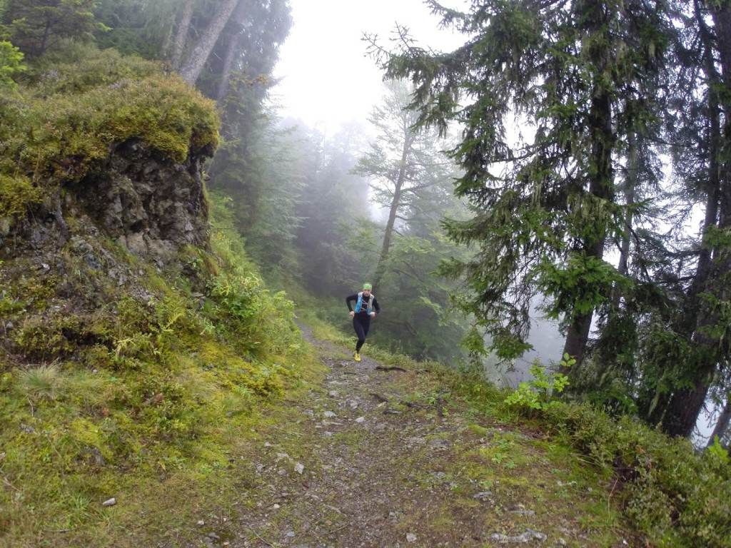 Einige Höhenmeter liegen jetzt bereits hinter uns und WU´s Stimmung schwenkte inzwischen um. Jetzt hieß es nur immer wieder: „Man ist das eine tolle Strecke hier“. Ich dachte mir nur meinen Teil. Laut sagte ich ihm, dass ich das ja schon immer gesagt hätte. Aber welcher Mann gibt der Frau schon gerne Recht. Der Trail führte uns jetzt wirklich steil durch den Wald durch vollkommende Einsamkeit. Der Nebel zog durch die Tannen. Mystische Stimmung. Wir schraubten uns weiter hoch über einen kleinen Trail der Wurzeln und Steine bot.