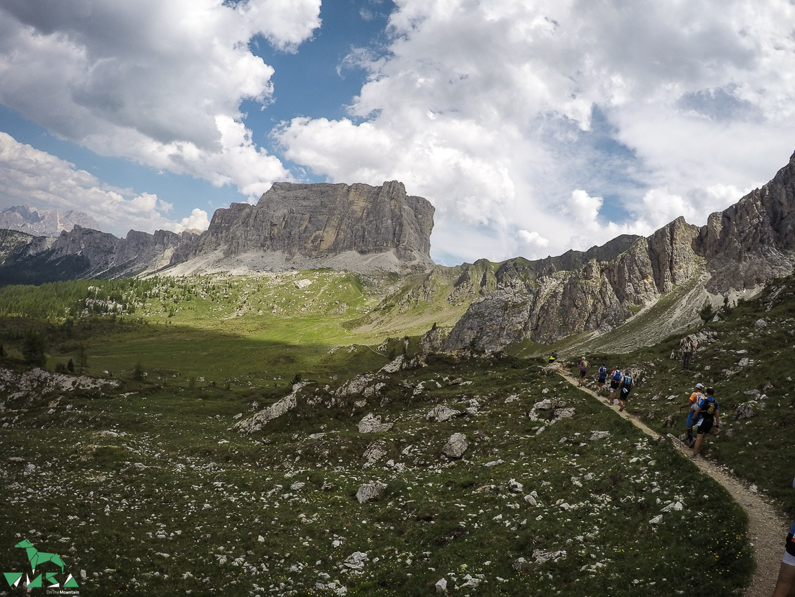 Wir machen uns schnell wieder auf den Weg, laufen hinunter und erwischen den Trail der uns zum Passo Giau bringen wird. Und wieder müssen wir uns einreihen und kommen nicht vorwärts. Für einige stellt das Blockwerk eine Herausforderung dar. Wir können nur ein paar Mal überholen, das ist aber mit Abstand fast der schönste Teil der Strecke. Er geht schnell vorbei und wir laufen durch die nächste große Verpflegungsstation Passo Giau.