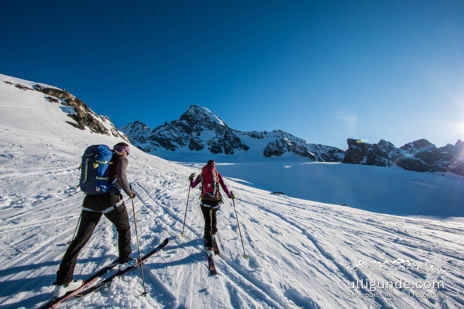 Treffpunkt ist Mittersill, wo wir Erika und Flo aufgabeln am vergangenen Freitagnachmittag (06.05.). Wir fahren gemeinsam mit guter Laune Richtung Kals in Osttirol, hinauf zum Parkplatz des Lucknerhauses. Der Parkplatz ist weniger voll als erwartet. Das stimmt uns positiv und ziehen zunächst zu Fuß mit den Ski auf dem Rücken los. Nicht lange, dann können wir bereits die Ski anziehen und direkt zur Stüdlhütte aufsteigen. Der Schnee hatte jetzt nicht die tollste Konsistenz, aber gut genug um aufzusteigen.