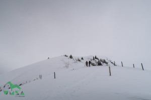 Wir entscheiden uns für den Aufstiegsweg über die Hochkasernkapelle. Dazu starten wir beim Parkplatz (Hirschegg) erst einmal Richtung Hochkasernalm. Als im Sinne des Aufstieges auf der linken Seite des Klingspitzes (von unten gesehen). Zu Anfang geht es über weite Wiesen hinauf – einfach der Spur folgen. Es liegen etwa 10cm Neuschnee, aber die Spur ist dennoch deutlich zu erkennen. Nach Wiese folgt der Wald, durch den wir über eine steile Spur aufsteigen. Danach kommt ein schönes Almgebiet mit ein paar Almhütten. Sehr schöne Lage. Den Grat und den Gipfel derKlingspitze, kann man zu diesem Zeitpunkt bereits immer sehen. Die Wolken, die sich über den Gipfel ziehen allerdings auch. Es würde windig werden am Grat, so viel war schon mal klar. Dennoch sind wir ziemlich froh gerade unterwegs zu sein, denn es ist so wunderbar menschenleer.