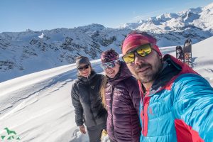 Wir sehen schon die unzähligen Spuren, die sich vom Gipfel des Mandlkogel runter ziehen. Aber wir würden sicher auch noch ein freies Spuren-Plätzchen finden. Der Plattenkogel hingegen ist kaum besucht. Interessanterweise. Noch mal auffellen lohnt sich aber total. Aber wir gehen erst einmal weiter zum Hochplateau. Dieses Stück zieht sich immer etwas, aber die Ausblicke an diesem heutigen Tag sind einfach unglaublich. Diese Fernsicht unschlagbar. Da erreichen wir dann doch recht schnell durch die Mulde den Hangrücken, über den wir in einigen steilen Spitzkehren direkt auf den Gipfel kommen. Kurzzeitig frischt der Wind auf – am Gipfel ist es erstaunlicherweise windstill. Nur eine weitere Gruppe steht oben und bestaunt mit uns die Fernsicht. Atemberaubend, wirklich. Bis zum Großglockner sehen wir. Die Abfahrt ist wie zu erwarten ein großer Genuss und natürlich finden wir noch unverspurtes Gelände. Wir fahren bis zum Fuß des Plattenkogels ab.