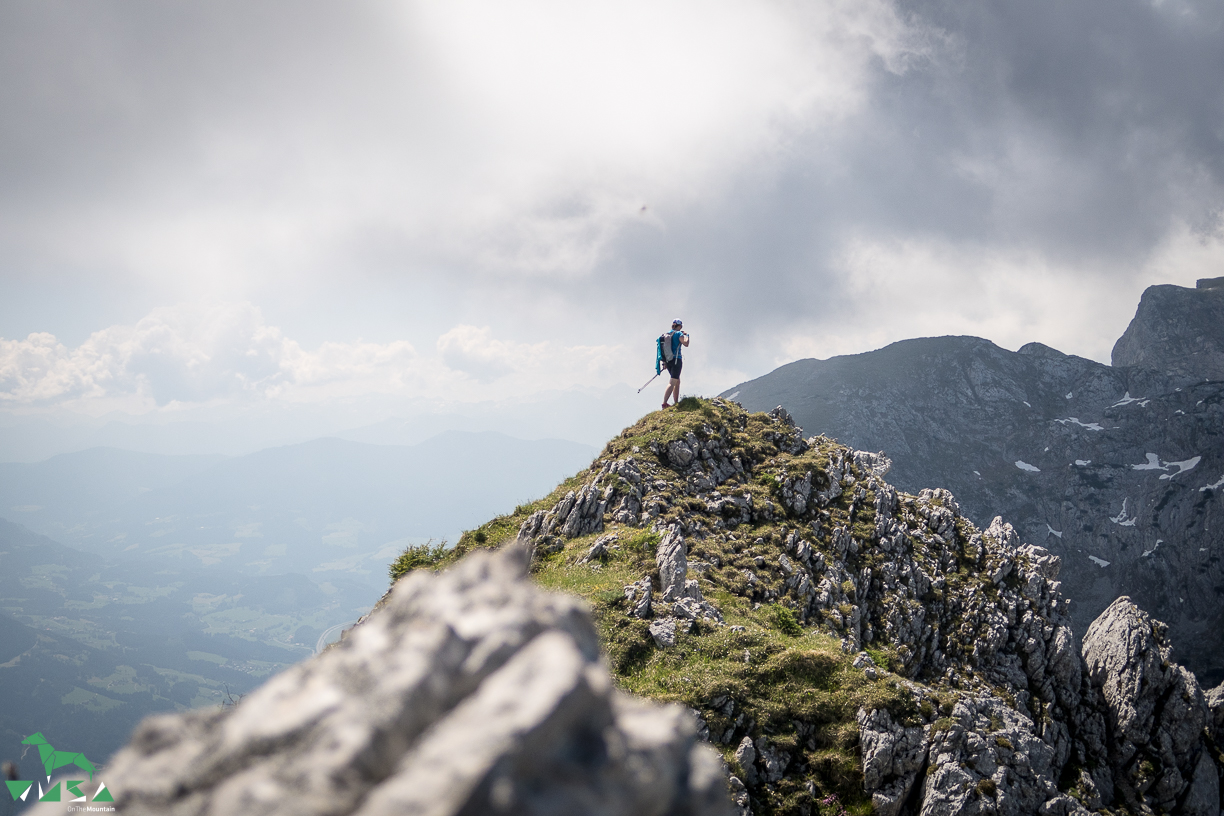 Wu navigiert uns runter vom Gipfel hinab zum Abstiegsweg. Die grenzenlosen Weiten des Hagengebirges wirken absolut sureal. Unglaublich. Menschen haben wir heute nur am Tristkopf gesehen, hierher verirrt sich wirklich kaum einer. Am Ende des Tages würden wir verstehen warum. Über den Wassersteinkopf erreichen wir dann den Abstiegsweg, der dann wieder markiert ist. Wu entschließt sich noch schnell auf das Hochgeschirr (2254m) rauf zu sprinten.