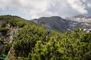 Luke bekommt sein Tragegeschirr an und wir machen uns auf den Weiterweg. Ein kleines Stück Richtung Osten runter vom Gipfel zum Grat. Wir folgen genau diesem teilweise sehr schmalen und felsigen Grat nach Süden absteigend. Luke fürchtet sich etwas, Wu trägt ihn daher sehr häufig. Kurze stellen sind im I.-Grat, es ist ziemlich brüchig bis wir die kleine scharte erreichen über die es dann wieder hinauf zur Tristkarschneid geht. Inzwischen hat Luke wieder Freude und wir den felsigen Teil größtenteils hinter uns. Aber wir stehen jetzt mitten im Gemüse, also in den Latschen. Nur hier und da erkennt man noch einen Steig, meistens ist er aber zugewuchert. Wir kämpfen uns durch – sprichwörtlich. Die blutigen Schrammen am Bein zeugen davon: Sommerbeine ade. Auf und ab, auf und ab und dann kommen wir endlich wieder auf weitläufiges Gelände.