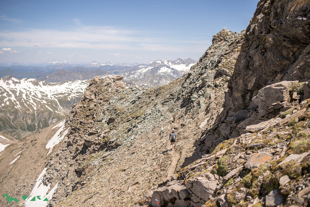 Ab der Hagener Hütte verändert sich die Landschaft deutlich. Es wird felsiger, aber auch bröselig. Zunächst führt uns der Weiterweg in Richtung Westerfrölkekogel – ein unscheinbarer Gipfelkreuzloser Berg, den man auch noch mitmachen könnte, wenn man gerne möchte. Wir halten uns allerdings etwas unterhalb und steigen dann an ihm vorbei auf direktem Weg zum Vorderen Geißlkopf. Es ist ein Grat dem man folgt, mal leichter, mal etwas anspruchsvoller. Trittsicherheit und Schwindelfreiheit ist hier ein Muss. Aber der Weg zieht sich schlussendlich auch ein bisschen.
